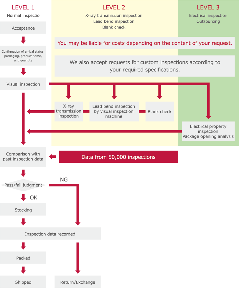 We respond to client requests using a three-level inspection system. All lots are inspected 100% by experienced and specialized inspectors. Please refer to the following regarding the flow of the entire process from arrival to shipment.